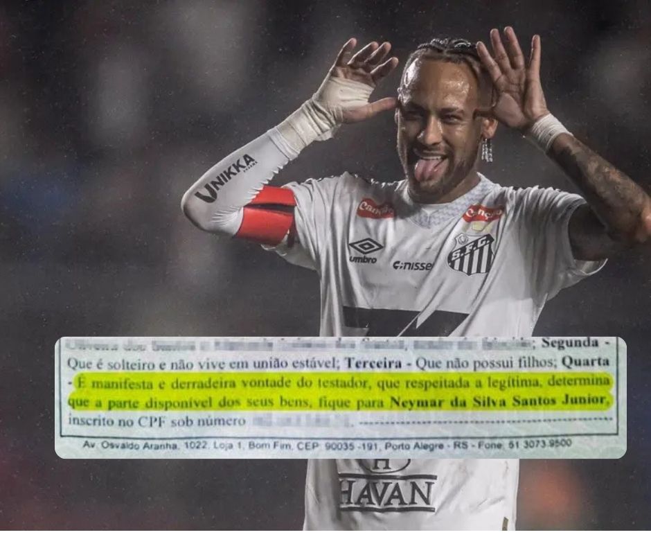 • No documento, consta a frase que reforça a decisão: “É manifesta e derradeira vontade do testador, que respeitada a legítima, determina que a parte disponível dos seus bens, fique para Neymar da Silva Santos Júnior”.