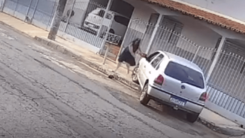 • Ao alcançar o portão de uma residência, ela tenta subir as grades, mas o homem avança com o carro e atinge o portão, derrubando a mulher no chão.