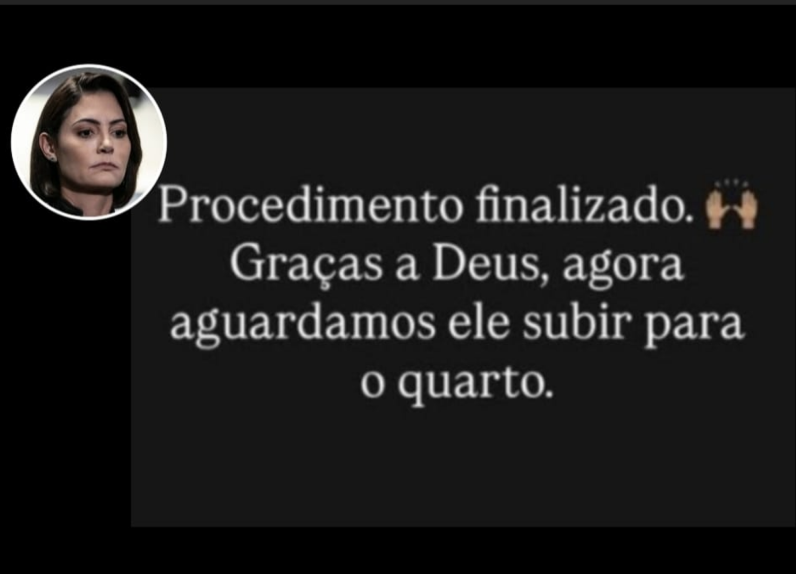 “Procedimento finalizado. Graça a Deus, agora aguardamos ele subir para o quarto”, escreveu Michelle.
