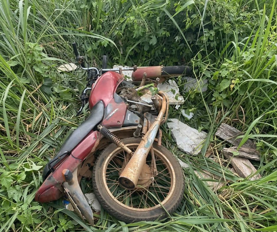 • A motocicleta foi localizada nas proximidades, bastante danificada devido à colisão.