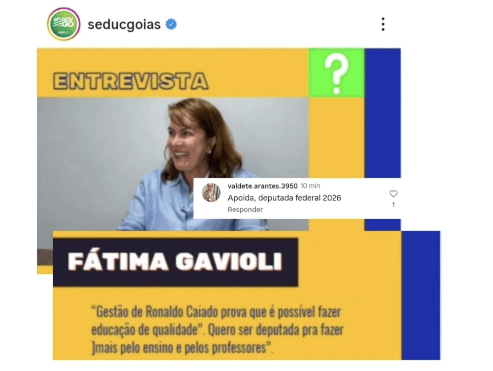 A secretária de Educação de Goiás, Fátima Gavioli, utilizou o perfil oficial da Secretaria de Estado da Educação de Goiás no Instagram, neste domingo (22), por volta de 12h, para publicar uma imagem com a frase: “Gestão de Ronaldo Caiado prova que é possível fazer educação de qualidade. Quero ser deputada para fazer mais pelo ensino e pelos professores”.
