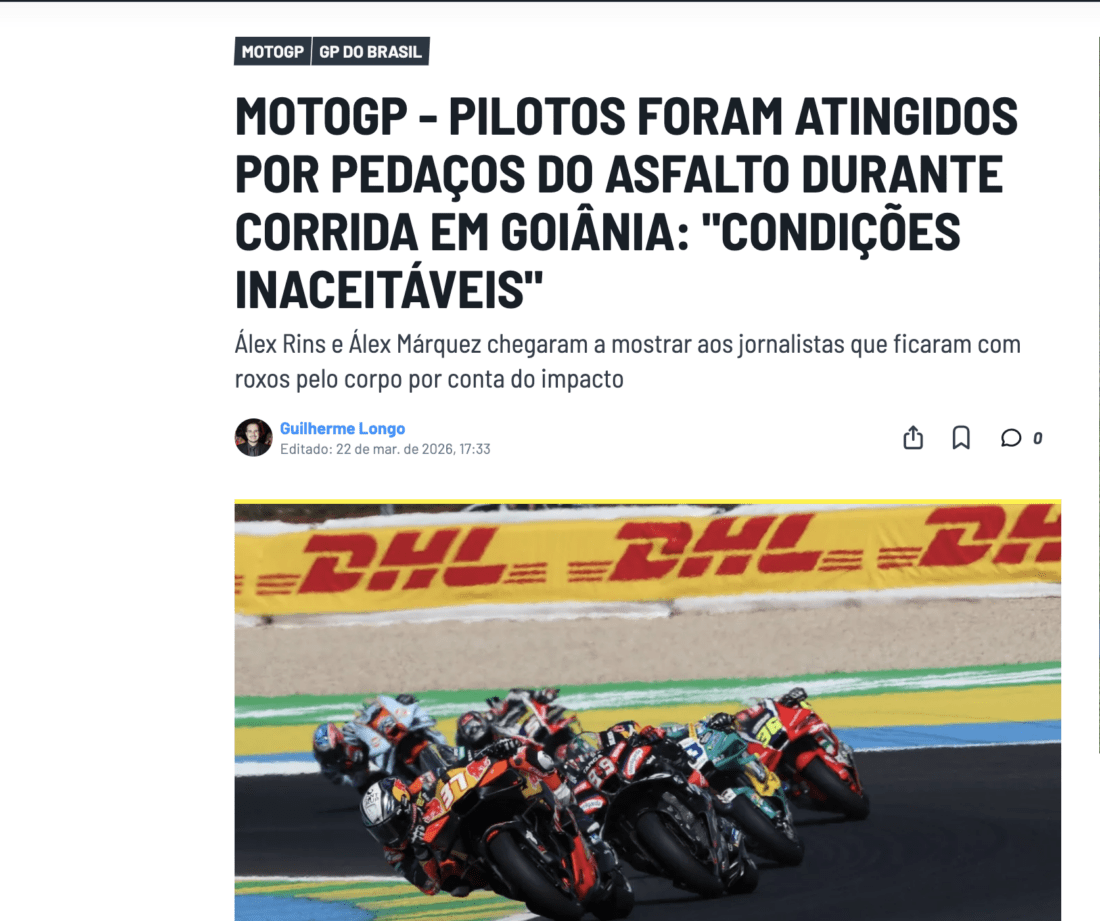 • Uma grande roubalheira? A etapa da MotoGP em Goiânia foi impactada por problemas na pista poucos dias após a entrega da reforma...